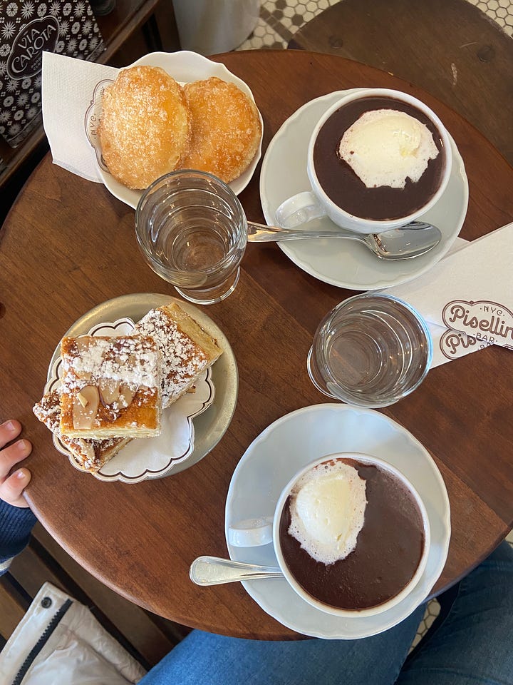 Last December, every time we went into the city we made a point to find a new spot to get hot chocolate looking for my favorite in the city. Some were thick and rich, almost pudding-like in consistency, others were lighter and less chocolate-y. One of my very favorites was found at the Hungarian Pastry Shop in Morningside Heights. It’s a small cafe with weekend lines snaking down the block, and tables smushed so close together you’re certain to bump your neighbor trying to take your coat off. Extra cozy. The hot chocolate comes in ceramic diner mugs, unsweetened, with bowls of whipped cream to dollop on top. Creamy, rich, and not too sweet, it’s my ideal cup of cocoa and I’ve been itching to create something similar at home.